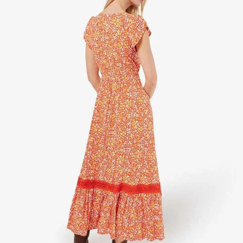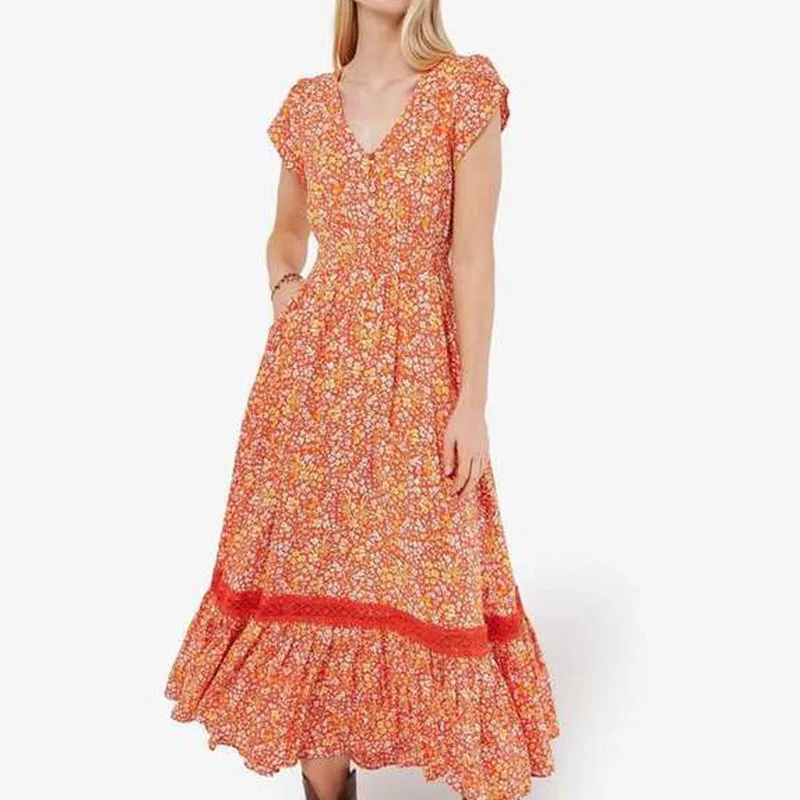 2024 Modest Fit And Flare V-Neck Side Pocket Ditsy Floral Crochet Lace Trim Maxi Women Casual Summer Dresses
