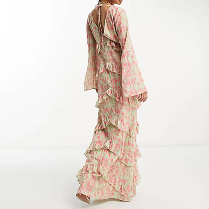 Autumn Women’s V-Neck Flared Long Sleeve Ruffle Trim Tie Back Mixed Floral Print Sexy Max Long Dress