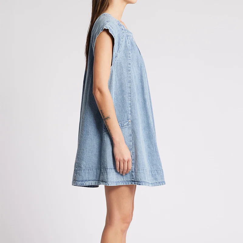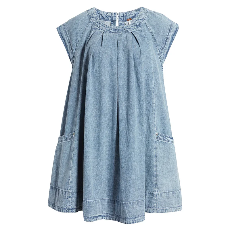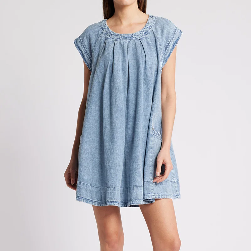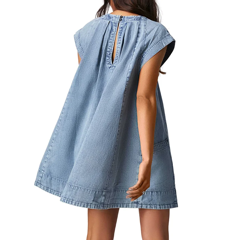 Denim Style Drop-in Pockets Mini Dress with Solid Cotton Pleated Denim A-line Women’s Dresses