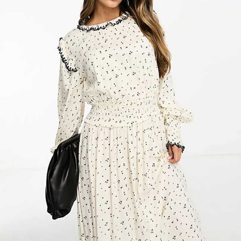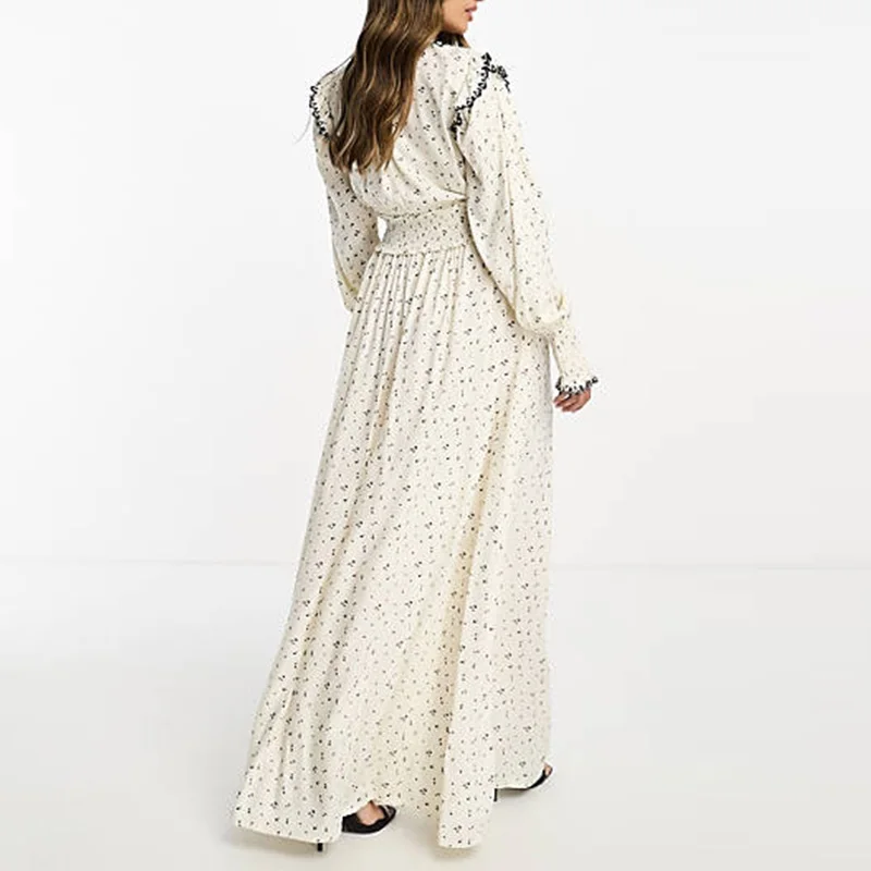 Design Lady Elegant Casual Dress Shirred Waist Frill Trim Fall Ditsy Embroidered Sweet Maxi Women’s Dresses