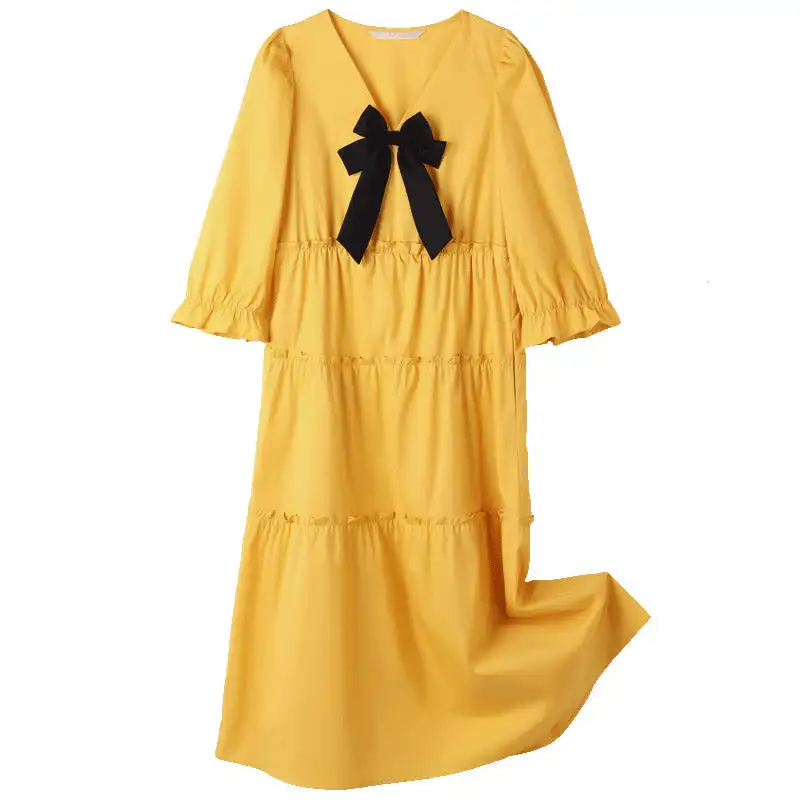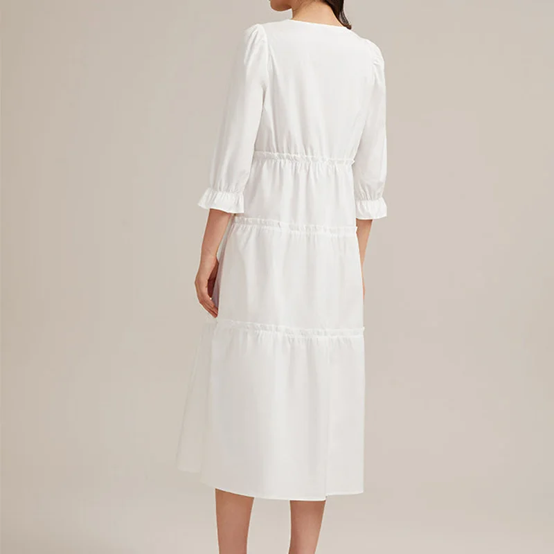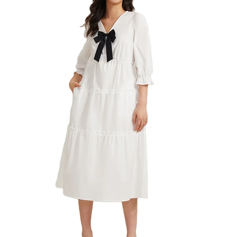 Fashion Ladies Elegant Sweet Dress White V-Neck Half Sleeve Bow-knot Tiered Fit Casual Midi Women Dress